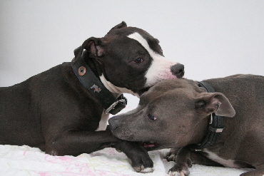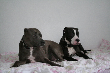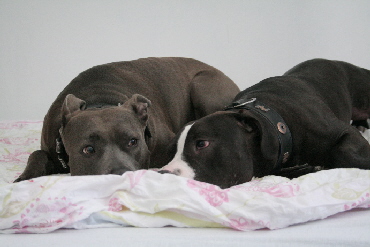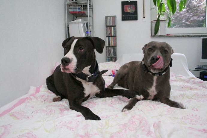 Callisto, unser Staff-Pitbullmix Mädel (*05.2001 -31.01.2017 ) und der Rüde Apollo (*04.2006). Beide stammen ursprünglich aus Berlin und fanden im Welpenalter den Weg zu uns über die Organisation “Bullterrier in Not”. Die beiden sind kastriert.